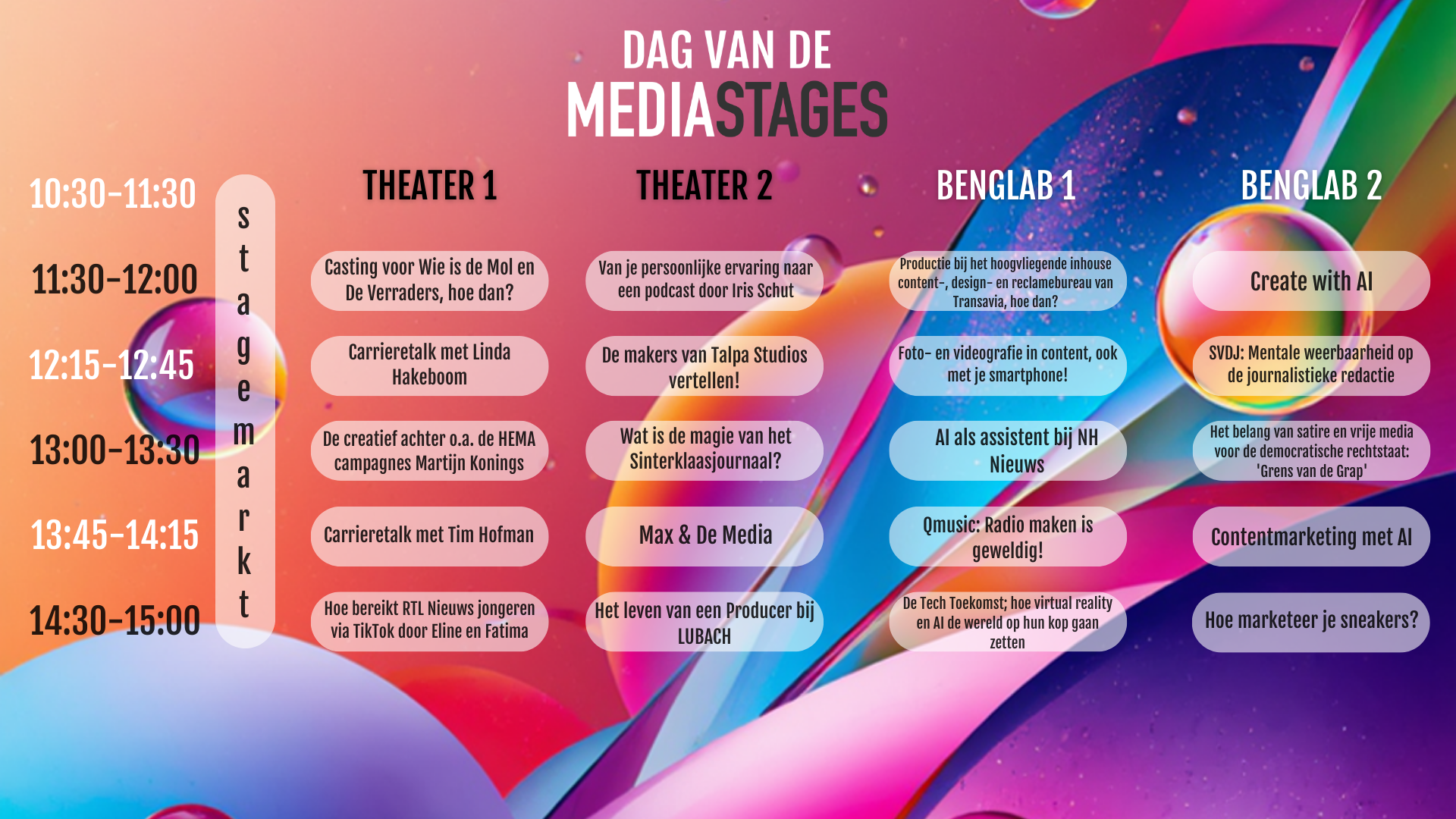 Dit jaar hebben we weer een bomvol programma voor jullie klaar staan! Met Talks van o.a. Tim Hofman en Linda Hakeboom, Dieke Elders van het Sinterklaasjournaal, tien leerzame workshops en je kan de hele dag mee kijken en luisteren naar de Podcast Academy van de Clipjesfabriek. Kom langs in de Wasstraat om je professionele identiteit te finetunen én neem een kijkje in de EMG regiewagen. Je kan naast alle activiteiten aanwezig zijn bij een talk én een workshop van jouw keuze!